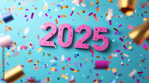 Vibrant celebration of the year 2025 with colorful confetti and festive decorations on a bright background, symbolizing joy and anticipation for the upcoming year.