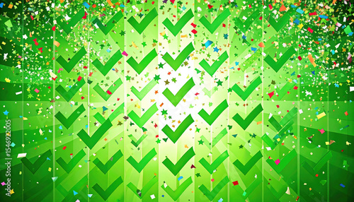 Vibrant checklist panel features symphony of green check icons, celebrating success with colorful confetti and joyful atmosphere