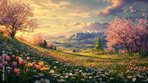 Vibrant Cherry Blossom Landscape at Sunset with Scenic Mountain View