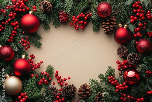 Vibrant Christmas background with red berries and ornaments for seasonal charm.