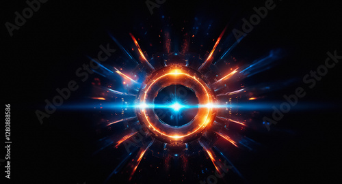Vibrant, circular energy radiates outwards, with bright blue and orange light streams emanating from a central point against a stark dark backdrop.