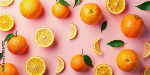Vibrant Citrus Fruits Arranged on a Pink Background, a Delightful Composition of Whole Oranges and Slices, Showcasing Freshness and Zest