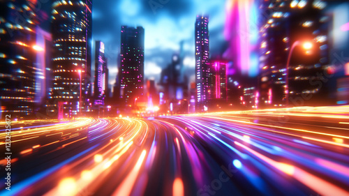 Vibrant city skyline at dusk with colorful lights and blurred motion effect, capturing the essence of urban nightlife