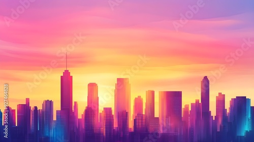 Vibrant City Skyline Sunset, Purple, Orange, Architecture