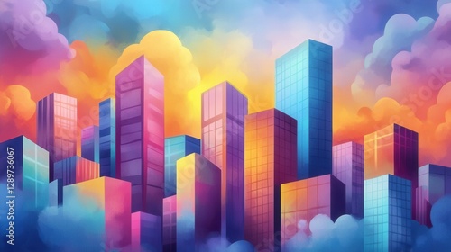 Vibrant Cityscape at Dusk with Colorful Skyscrapers and Dreamy Clouds in a Stunning Digital Art Style