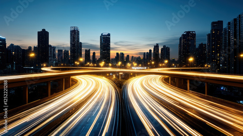 vibrant cityscape at dusk with illuminated highways and skyscrapers