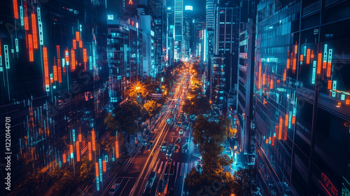 Vibrant Cityscape at Night with Dynamic Data Overlay