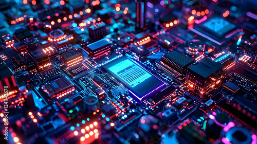 Vibrant close-up of a futuristic circuit board with glowing components and lights