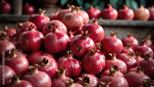 Vibrant close-up of a heap of ripe red pomegranates showcasing their natural texture and rich colors in a rustic setting.