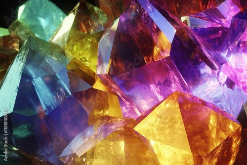 Vibrant Close-Up of Multi-Colored Crystals with Sharp Edges and Reflective Surfaces Capturing Light in a Stunning Display of Natural Beauty and Geometric Perfection