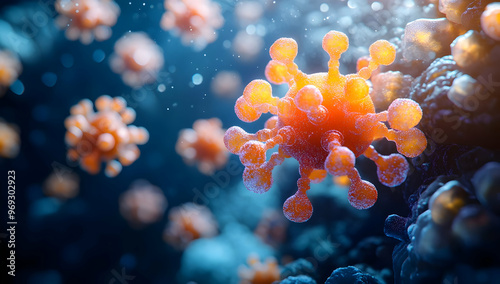 Vibrant close-up of virus particles in a colorful underwater environment, showcasing scientific beauty and complexity.