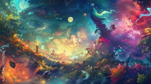 Vibrant close-up of whimsical and imaginative fantasy characters gracefully dancing amidst dreamy landscapes in an artistic wallpaper design, igniting the imagination.