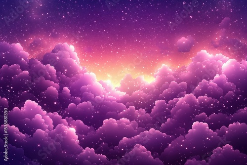 Vibrant clouds at sunset create a magical sky filled with stars over a serene landscape
