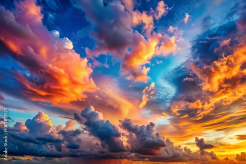 Vibrant clouds streak across a kaleidoscope of blues, oranges, and pinks at sunset, creating a breathtaking, whimsical,