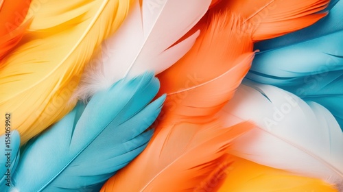 Vibrant collection of colorful feathers arranged beautifully, showcasing a blend of oranges, blues, yellows, and whites, ideal for artistic and design projects.