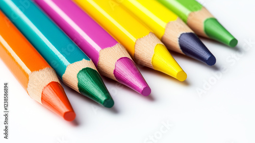 Vibrant colored pencils on white background: rainbow hues and sharp tips