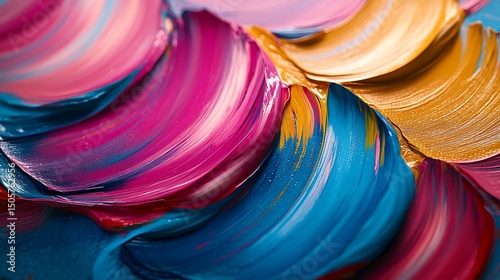 Vibrant colorful brush strokes sweeping across a canvas, bold blends of teal, magenta, and gold, lively textured surface full of movement and energy. Created Using: Acrylic paint medium,