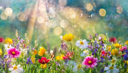Vibrant Colorful Flower Meadow Bathed in Sunbeams and Enchanting Bokeh Lights A Stunning Summer Nature Background Banner Capturing the Essence of Serenity and Beauty in Blooming Landscapes