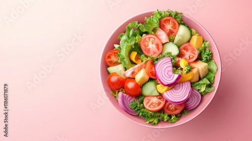Vibrant Colorful Salad Bowl with Fresh Vegetables and Greens on a Pink Background, Top Down View, Healthy Eating Concept