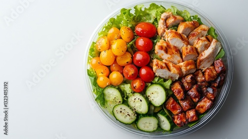 Vibrant colors bring life to this cobb salad featuring crisp greens, juicy tomatoes, tender chicken, and crunchy cucumbers, all neatly arranged in a plastic container for easy enjoyment