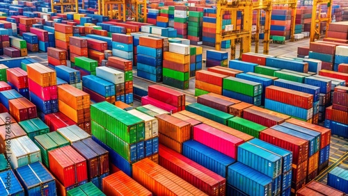 Vibrant colors of cargo containers stacked in rows at a busy port, awaiting shipment, representing global trade, transportation, and logistics industries in modern commerce.