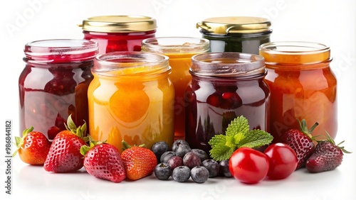 Vibrant colors of fruit jam fill clear jars against a crisp white background, creating a visually appealing