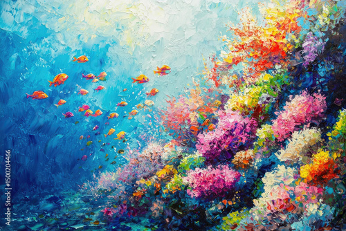 Vibrant coral reef teeming with colorful fish, a breathtaking underwater scene painted with expressive brushstrokes.