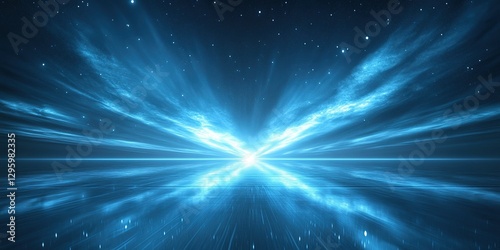 Vibrant cosmic explosion radiating light and energy in a starry night sky over a serene reflective surface