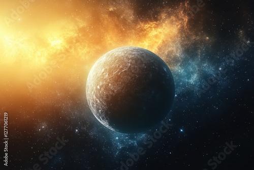 Vibrant cosmic landscape showing a planet surrounded by colorful celestial phenomena