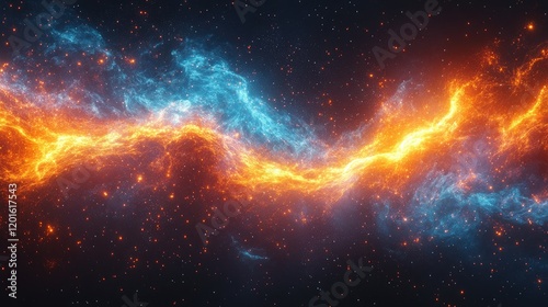 Vibrant cosmic nebula with swirling orange and blue gases illuminated against a starry backdrop
