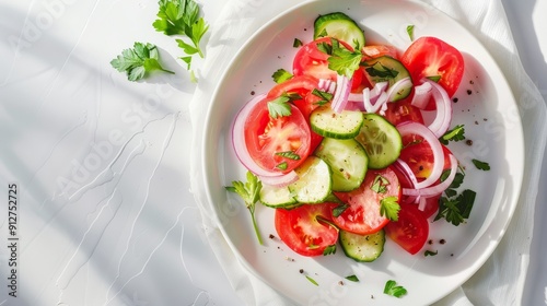 Vibrant cucumber and tomato salad topped with fresh parsley in natural light, emphasizing a healthy, delicious, and refreshing meal.