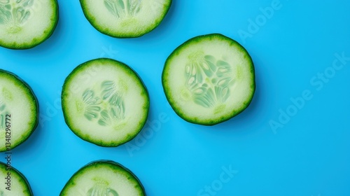 Vibrant cucumber slices resting on a bright blue background capturing freshness and nature