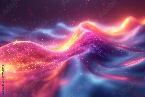 Vibrant, curved neon wave in 3D with a holographic sheen. Set against a colorful, abstract background for depth. HD realism.
