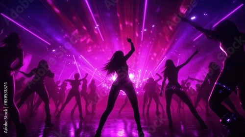 Vibrant dance party scene with silhouettes against colorful lights. Energetic atmosphere filled with music and movement.