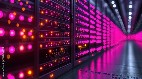 Vibrant data center illuminated by colorful lights during nighttime operations