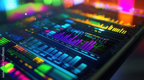 Vibrant Data Visualization on a Tablet: A Futuristic Display of Financial Charts and Graphs