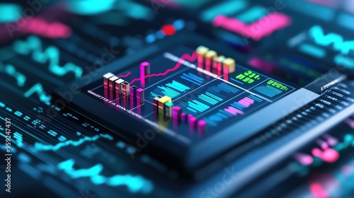 Vibrant data visualization with interactive charts and graphs, showcasing intricate analytics on a dark screen.