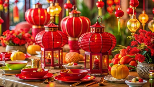 Vibrant decorations, traditional red lanterns, and ornate tableware adorn a colorful table setting, ready for a festive Chinese Lunar New Year family celebration.