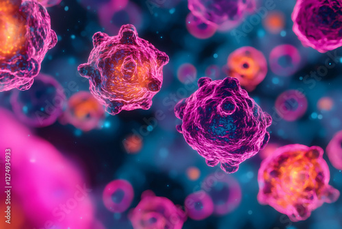 Vibrant digital artwork of cancer cells showcasing intricate details and colors. image captures complexity and beauty of cellular structures