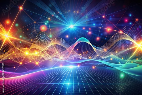 Vibrant digital background illustration featuring a futuristic technology wave with glowing motion, geometric shapes, and intricate lines in a mesmerizing futuristic design.