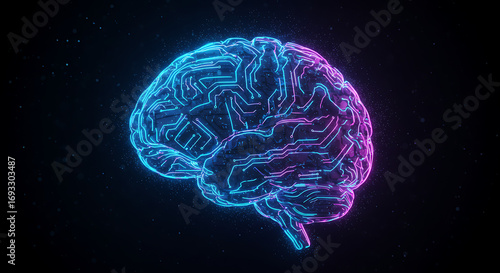 Vibrant Digital Brain in Neon Hues: Glowing Futuristic AI Concept with Circuitry Patterns, Representing Artificial Intelligence, Machine Learning, and Cognitive Computing