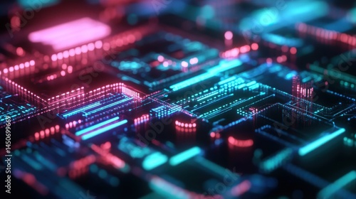 Vibrant digital circuit board, abstract colorful patterns in neon blue and pink, symbolizes technology and innovation.
