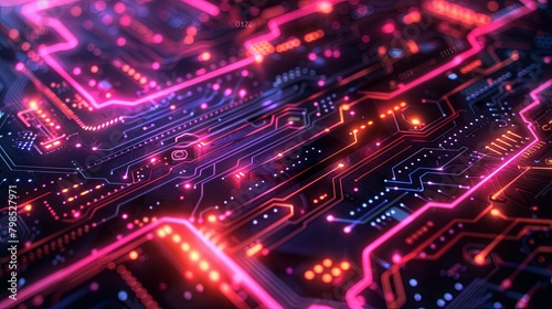 Vibrant digital circuit board with glowing neon lights and connection lines.