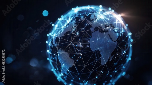 Vibrant digital globe made up of a network of blue glowing points and lines symbolizing worldwide technological innovation and data exchange