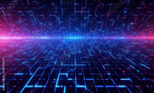 Vibrant digital landscape with blue and pink glowing lines creating a futuristic ambiance.