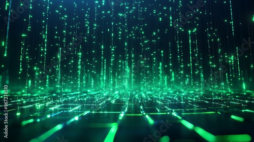 Vibrant digital landscape with glowing green lights and data streams, perfect for technology and cyber themes. Stage for product presentation.