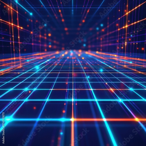 Vibrant digital landscape with glowing lines and dots creating a futuristic feel.