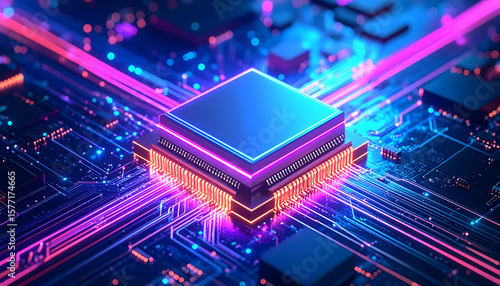 Vibrant digital pathways illuminate a powerful central processing unit on a futuristic circuit board