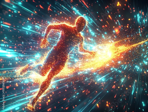 Vibrant Digital Runner Poster: Capturing the Dynamic Fusion of Sports and Technology Against a Deep Space Backdrop – Perfect for Sporty Interiors!
