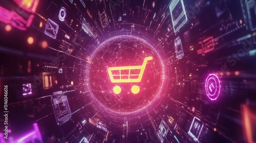 Vibrant Digital Shopping Cart Interface with Colorful Neon Lines and Data Visualization Elements Reflecting Modern E-commerce Technology and Online Retail Trends